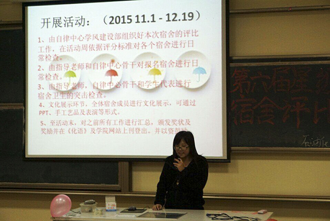 为强化学生宿舍管理,营造温馨和谐的宿舍生活学习氛围,石油化工学院食品学院于11月6日下午在W7阶举办了第六届星级文明宿舍评比活动的启动仪式。出席活动的有报名参加活动的各宿舍成员、院自律中心骨干、学生宿舍九号楼宿管阿姨。