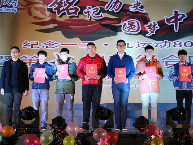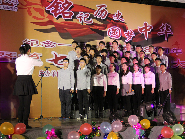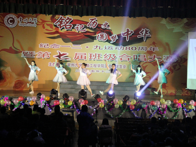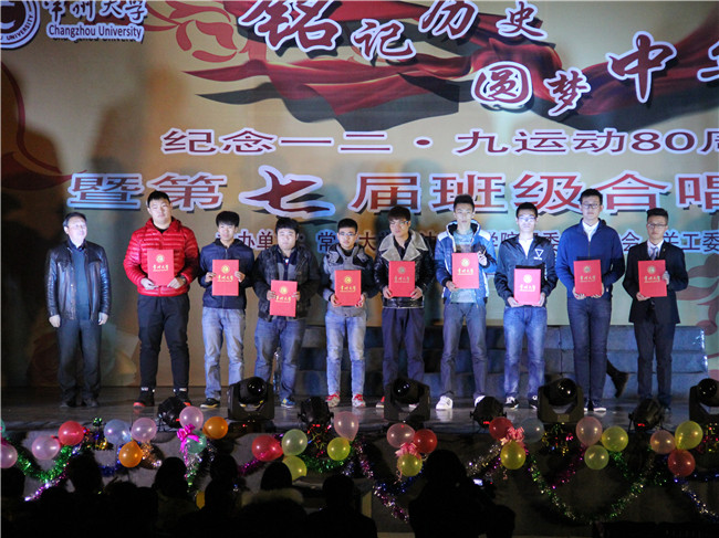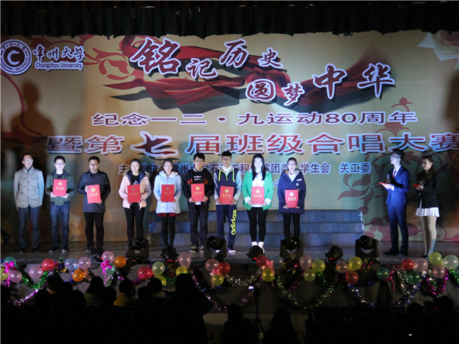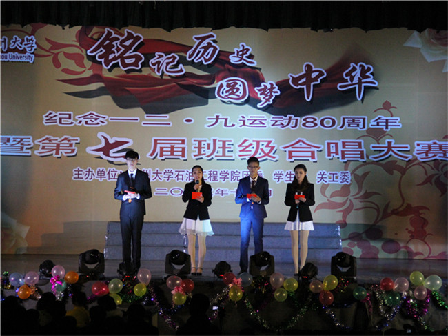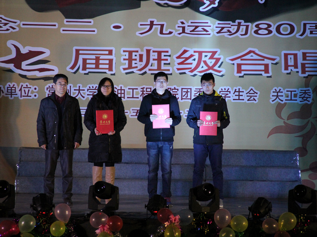忆往昔峥嵘岁月,抒今朝爱国情怀。值一二·九运动八十周年之际,为弘扬爱国主义精神,增强学生们的责任感、使命感和集体荣誉感,展现当代大学生积极向上、朝气蓬勃、奋发进取的精神风貌,12月4日晚,由石油工程学院团委、学生会、关工委举办的“铭记历史,圆梦中华”纪念一二·九运动80周年暨第七届班级合唱大赛在白云校区大礼堂举行。白云校区管委会副主任张鍠、院关工委肖立川老师、院长王树立、党委副书记陈粲、热能系主任王政伟、建环系主任郭强、学院办公室主任嵇炜应邀出席,钟楼区西林实验学校音乐老师李峰杰老师、怀德学院马磊老师、院学工办宋佳老师、王华老师、院研究生会主席张锦、院研究生党支部书记康甜甜、院团委副书记胡居迎应邀担任合唱大赛评委。该院2014级和2015级班主任老师及各年级辅导员老师出席本次活动。