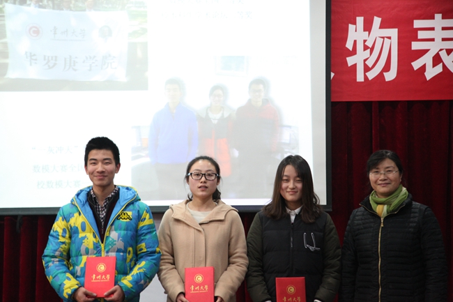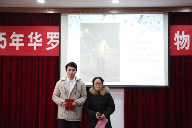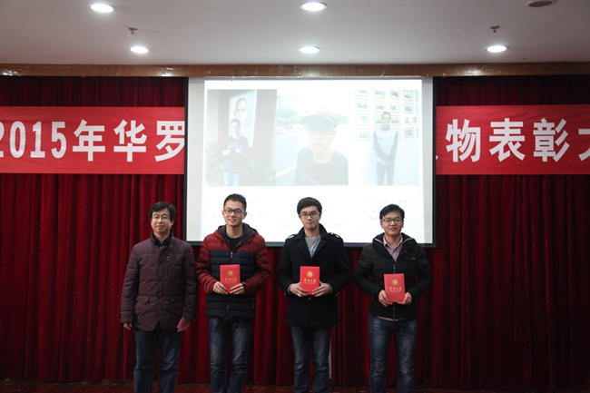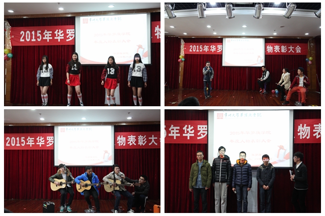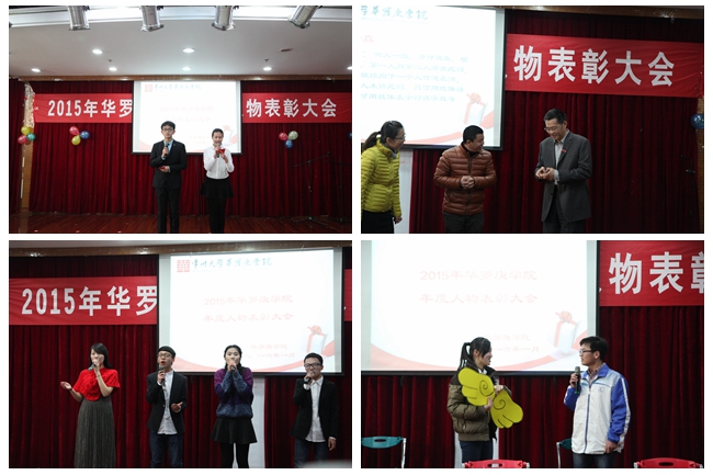 本年度人物评选大会,学院本着“身边榜样,前行力量”的主题,对2015年度在学术创新、社会实践、公益服务等不同领域取得突出成就的集体和个人进行评选。华罗庚学院团总支历时一个月,通过微信平台广泛宣传、投票。最后选出华院年度勤学奖、年度创新奖、年度致用奖、年度公仆奖、年度爱心奖、年度活力奖、年度尚美奖、年度金语奖、年度博闻奖、年度协作奖等十项单项奖和“华院年度人物奖”。伴随着华院全体同学自行编排了《华院好声音》、《相亲相爱》、《平凡之路》等文艺节目,华罗庚学院年度人物各单项奖各归其主,颁奖嘉宾宣读颁奖词后,宣布获奖名单并与之合影留念,评选大会也步步推向高潮。最后通过现场微信平台投票,常州大学校长、华院151班主任浦玉忠教授揭晓2015年度人物大奖,来自华院131班吴炳泉同学摘得桂冠,至此华罗庚学院2015年度人物评选大会落下帷幕。