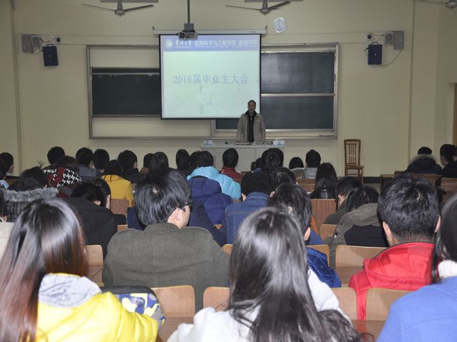 为保障毕业生高质量地完成毕业设计,引导毕业生树立正确的就业观,进一步推进学院毕业生工作,近日,信息科学与工程学院 数理学院在W5阶举行2016届毕业生大会。学院党委副书记储志新、副院长孙霓刚出席大会。大会由本届毕业班辅导员刘巍老师主持。