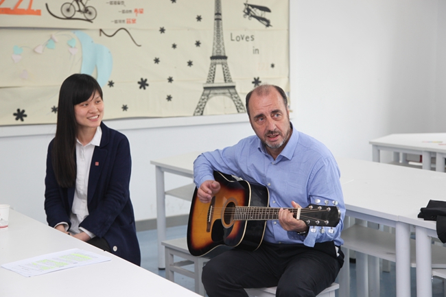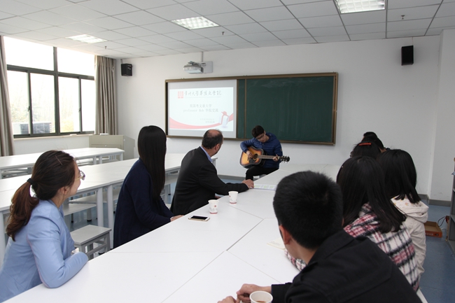 在讲座过后,Bob教授针对华院学子与考文垂大学学生之间的网络互动项目,进行了沟通。针对该项目具体的实施和操作流程,以及对相隔万里的高校大学生之间交流实现无缝对接。期间,Bob教授与142班朱云鹏同学用吉他对两国的音乐文化进行了展示,用音乐的无国界拉近了相互之间的距离。
