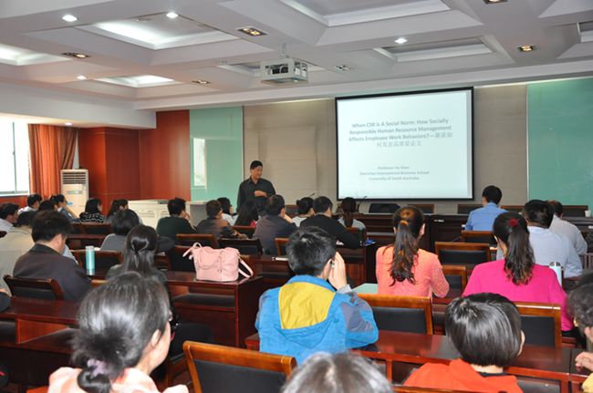 近日,知名人力资源管理领域学者、南澳大利亚大学沈捷教授应邀到我校商学院进行学术交流。交流期间,沈教授为商学院教师、研究生们做了题为“When CSR Is A Social Norm: How Socially Responsible Human Resource Management Affects Employee Work Behaviors?—兼谈如何发表高质量论文”的学术报告,报告会由商学院院长张宏如主持。