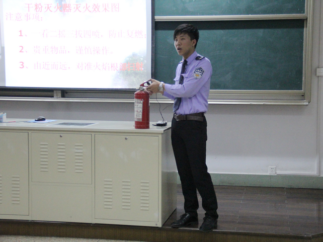 栾晓鹏教员向同学们展示了近几年来发生的几次火灾事故图片和视频,一幅幅触目惊心的图片、一段段发人深省的视频让同学们震撼不已。他结合现实生活中人们对火灾安全意识的淡薄,警醒大家:火灾隐患就在自己身边,一定要提高自己的消防意识。光有消防意识尚且不够,还要有一定的消防知识,栾教员向同学们展示了日常生活中常见的消防设施以及消防器材的使用方法,并现场演示了干粉灭火器的使用方法,让大家对消防知识有了更直观的了解。栾教员号召全体同学做好消防知识普及宣传员,将消防知识传给身边的每一个人,担当起应尽的责任,共同维护消防安全。