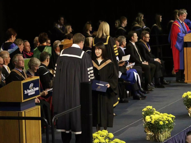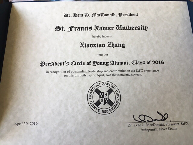 近日,加拿大圣西维尔大学(STFX University)举行隆重的毕业典礼,我校中加113班张筱筱同学以优异成绩毕业,同时获得STFX优秀青年校友、优秀领导力两项大奖,圣大MacDonald校长在典礼上亲自授予荣誉证书。