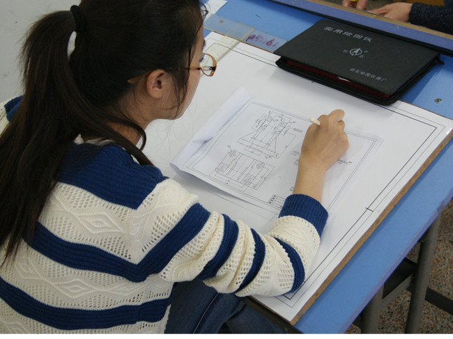 在画图前,不少人用胶带定位图纸四个角,防止位移,体现了同学们认真严谨的态度。在分析样图时,同学们仔细揣摩图形,细心的在图纸上规划画图区域。度量尺寸,画辅助线,定位图形,同学们一步步的抄画,一丝不苟的处理着细节。一些比较难想象的图,有的同学在纸上画了简单的三维图便于理解,有的徒手笔画,无不体现着智慧。比赛结束时,看着完成的图纸,同学们露出了欣喜的微笑。