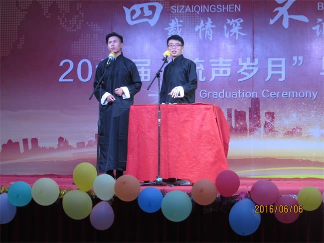 晚会分忆·往昔岁月稠、争·以梦为马行、望·前程多锦绣三个篇章,包含了现代舞、爵士舞、歌曲、哑剧、话剧、相声等表演形式,内容丰富多彩。在单程票乐队带来的《那四年》中晚会拉开序幕,唱出2016届毕业生四年的生活印记,勾起了毕业生的点滴回忆。相声《雅俗共赏》、话剧《fighting,邮递村》或轻松幽默,或激情澎湃,展现了同学们相识相聚,一起奋斗创业的青春岁月。紧接着由校舞蹈团带来的《金陵十三钗》,更是将全场观众的激情点燃,她们通过优美的舞姿演绎着风情万种,诉说着抗战时期普通国人的爱国情怀。优秀毕业生代表对母校和老师们表达了感谢,对学弟学妹们提出了中肯的建议。