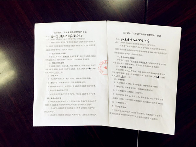 近日,制药与生命科学学院与常州华健药用包装有限公司、江苏道宁药业有限公司签订奖学金协议。常州华健药用包装有限公司设立“华健学业进步奖学金”,旨在奖励在校期间认真学习,学业取得进步的学生。江苏道宁药业有限公司设立“江苏道宁自强不息奖”,旨在奖励自强自立、积极进取的优秀学生。根据协议,每个公司将每年出资1万元,每个协议周期为四年,用于奖励学院10名表现突出的优秀学生。奖学金奖励对象面向学院的在校学生。