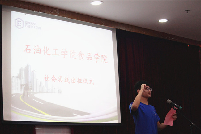 7月7日上午,石油化工学院在多功能厅举行了2016暑期社会实践出征仪式。院长助理宣慧、李正义,社会实践指导老师代表高晓新、邹平、马壮、周本卫等以及学院22支校级、院级社会实践小分队成员参加了本次出征仪式,大会由院分团委书记程晓军主持。