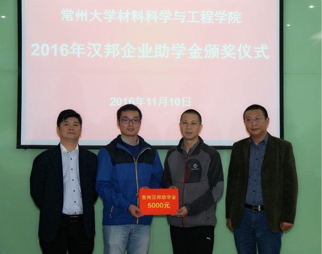 常州汉邦工程塑料有限公司2016年起在材料学院设立“常州汉邦助学金”,本次共资助本科生、研究生10名,每人5000元。(通讯员/蔡振宇)