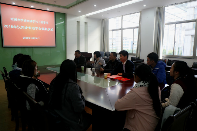 2016年11月10日下午,材料学院举行了“常州汉邦助学金”颁发仪式暨受助学生座谈会。常州汉邦工程塑料有限公司董事长、我校高分子专业校友黄旭辉先生一行出席了颁发仪式,院长陈智栋,院党委副书记李文明及全体受助学生参加了本次颁发仪式。颁发仪式由李文明主持。