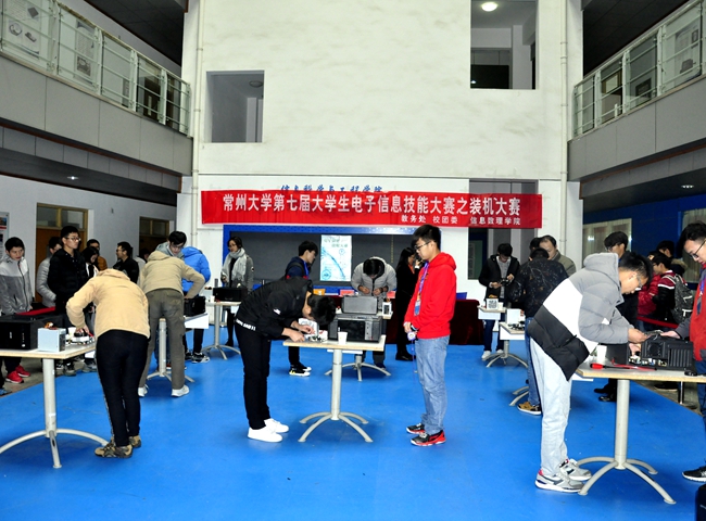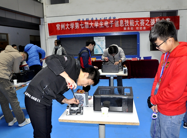 11月23日,由校教务处、校团委主办,信息数理学院承办的第七届大学生电子信息技能大赛之装机大赛在文彬楼一楼大厅举办。教务处副处长江一山、校团委副书记葛涛、信息数理学院党委副书记储志新、常州大学电脑120创始人张景洲应邀出席并担任此次大赛的嘉宾。