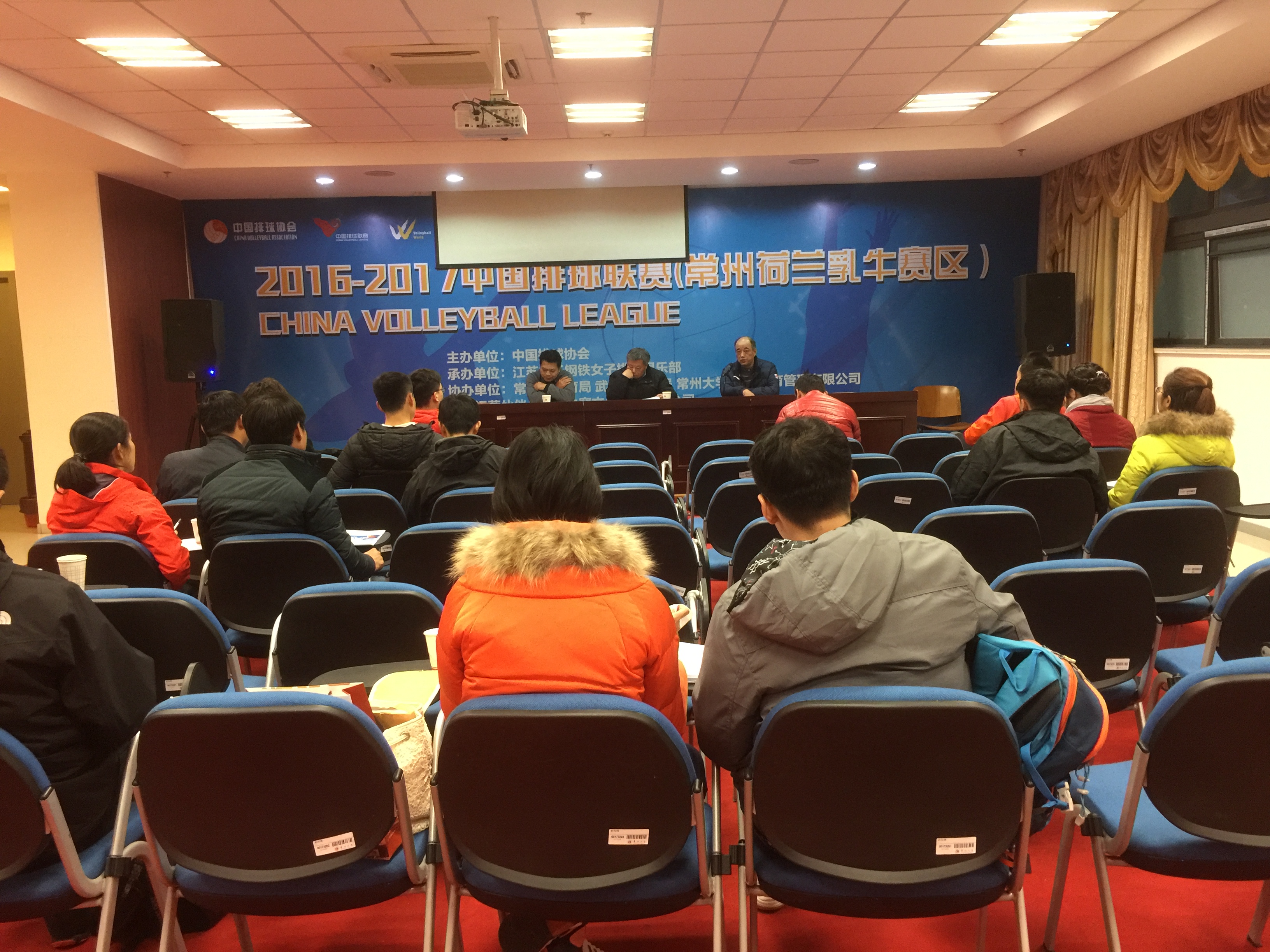 25日下午,本次比赛技术会议在武进校区体育馆新闻中心召开。苏南分会主任、常熟理工学院体育部主任戴福祥、裁判长赵洪明、常州大学体育学院党总支书记李荣出席会议,各代表队领队、教练员参加会议。会议由李荣主持。会上,李荣书记介绍了比赛的筹备情况,希望各参赛人员在常州大学参赛期间平安、开心、顺利,对于不足之处多提宝贵意见。戴福祥主任对常州大学的筹备工作表示肯定与感谢,同时要求各参赛队比赛期间注意交通、饮食安全,发挥水平,取得优异成绩。赵洪明裁判长介绍了本次比赛的相关规则,主持了抽签仪式,随后对全体裁判员进行业务培训。