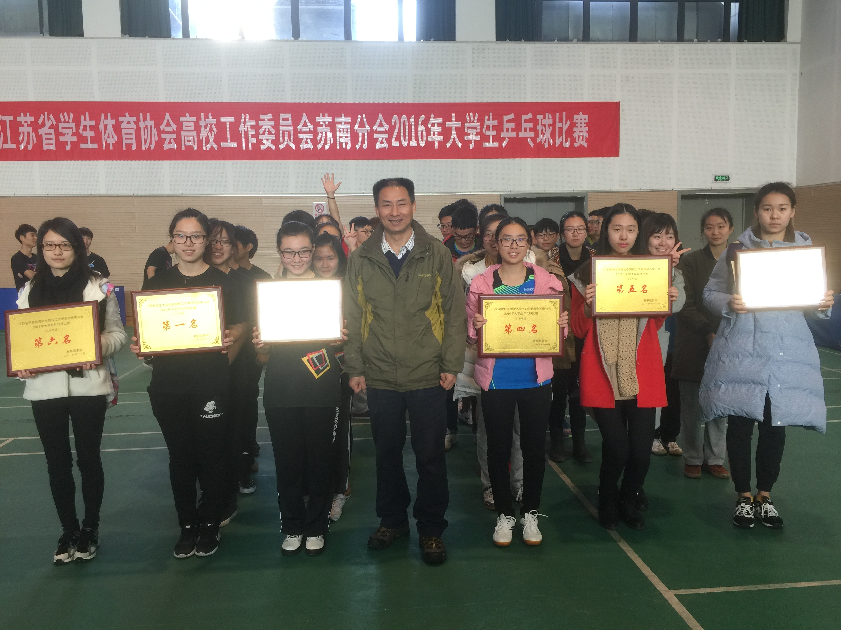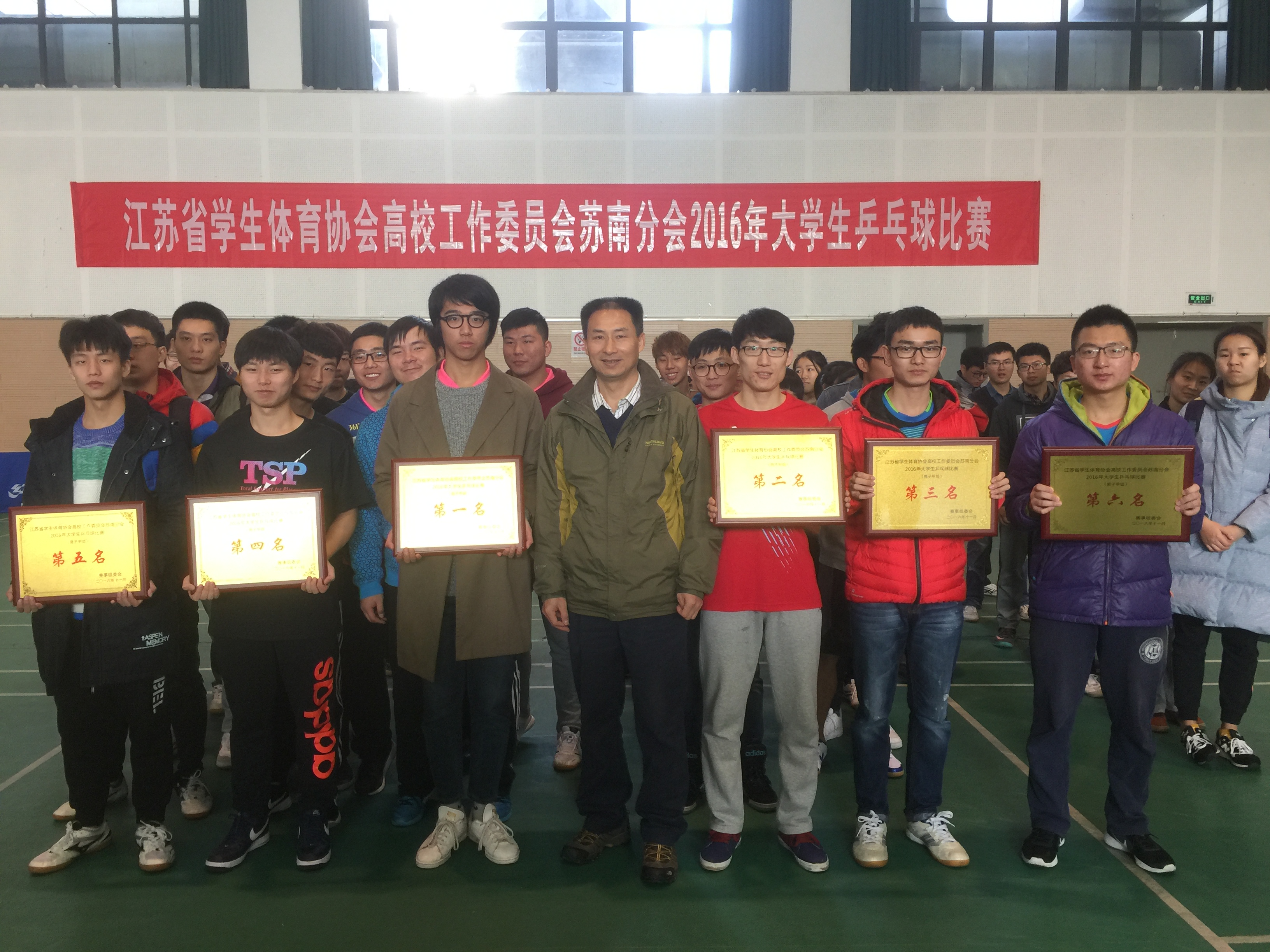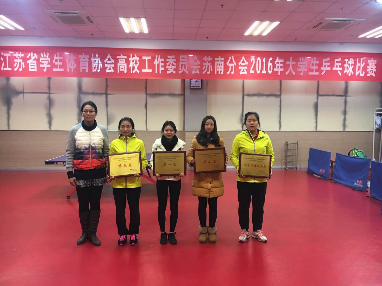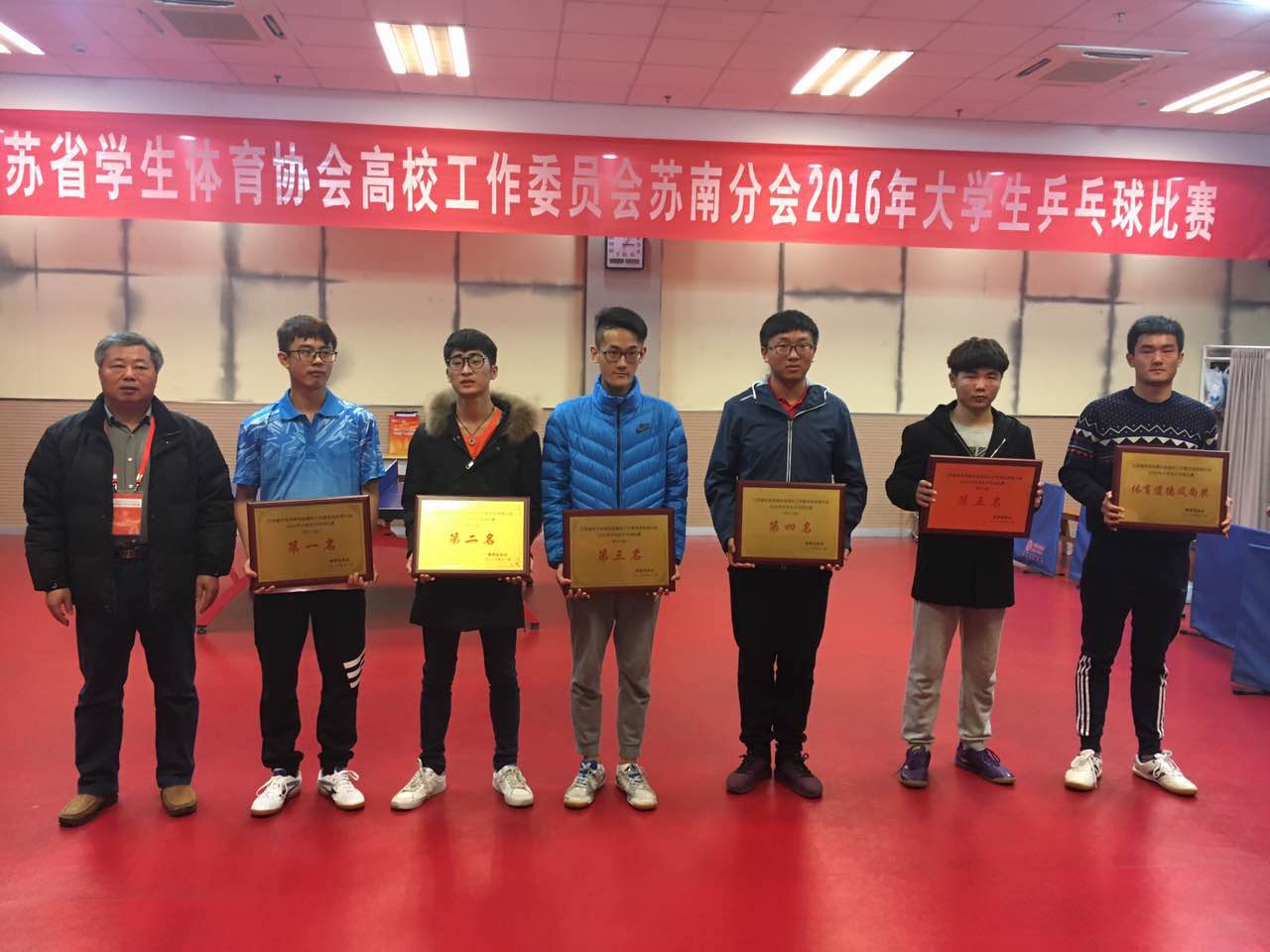 11月25日-27日,由我校承办的江苏省学生体育协会高校工作委员会苏南分会2016年大学生乒乓球比赛在我校武进校区体育馆举行。比赛设甲组(本科院校组)男、女团体赛和乙组(高职院校组)男、女团体赛,共有14所会员高校、150余名运动员报名参赛,其中本科院校组男、女队各9支,高职院校组男队5支、女队3支。我校男、女代表队参加甲组比赛,均夺得第二名的好成绩,方耀、李剑寒被大会评为体育道德风尚奖运动员。