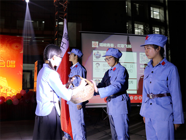 今年恰逢红军长征胜利80周年,为弘扬伟大长征精神,在本次比赛参赛曲目中,《十送红军》为必选,另一首自选。当红色经典《十送红军》的旋律飘荡在广场上方时,将大家的记忆带回到了红军长征的历史画卷中。璀璨灯光下,整齐的服装,有序的队次,精心设计的表演,新生们的自信与激情在舞台上得到了完美绽放。当然,每支队伍也都有属于自己的特色。其中,金融工程专业的十送红军小短剧将百姓与红军的真挚感情生动地演绎出来,自选曲目《我的未来不是梦》、《龙的传人》、《明天会更好》、《相亲相爱》等也深深地打动着现场的评委与观众。古筝弹奏、诗歌朗诵、优美舞蹈等形式的插入不仅增添了合唱的厚重感,更体现出同学们对比赛的重视。最后,经过激烈的角逐,会计、营销、人力、金融、信管获得三等奖,财务管理、国贸、物流获得二等奖,金融工程摘得桂冠。