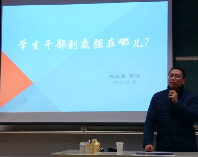 为进一步加强学生干部队伍建设,提高广大学生骨干的政治素质和业务能力,12月6日晚,艺术学院团委在白云校区南6阶举办了以“学生干部到底强在哪里”为主题的讲座,由校团委副书记葛涛担任主讲人。