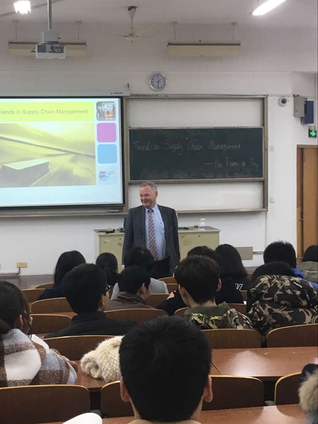 张宏如院长和Frans de Jong教授分别介绍了各自学院的发展历史、办学方向以及教学科研成果,双方在学生培养和科学研究等方面达成初步合作意向。Frans de Jong教授一行参观了该院创新创业实验室和物流实验室,观摩了一节《国际物流》实验课程,对创新创业方面的成效表示肯定。Frans de Jong教授还为物流管理专业的师生作了一场题为《供应链管理发展趋势》的讲座,并与师生进行了互动。(通讯员 陈珊)