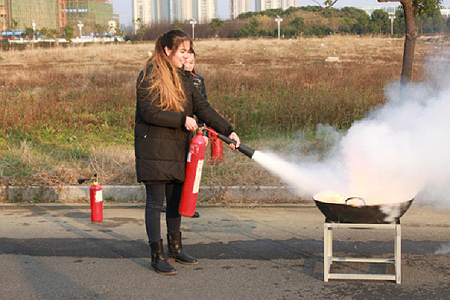 留学生们在化工楼西侧进行了灭火演练。安全员向留学生演示了灭火器的正确使用方法、步骤和灭火姿势,然后安排留学生现场实操灭火。