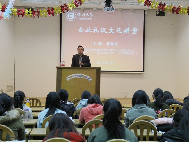 近日,石油工程学院特邀中国联合网络通信有限公司常州市分公司城区局长蒋黎俊为学院女生做企业礼仪讲座。讲座在白云校区图书馆报告厅举行,石油工程学院全体女生参加此次讲座。