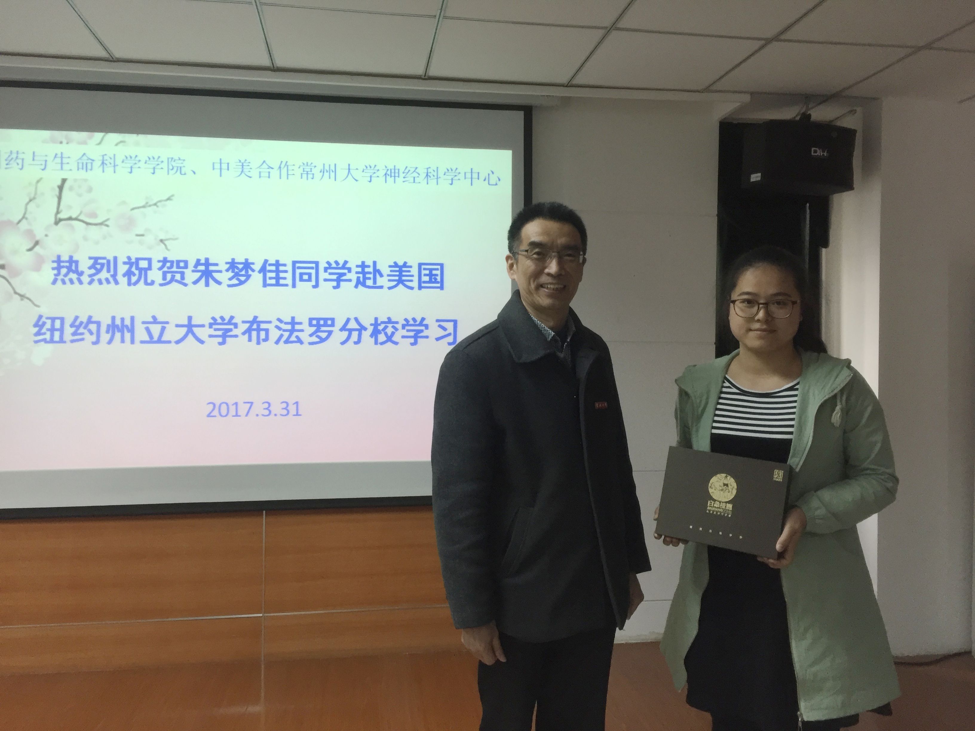 4月11日,研16(生化)朱梦佳同学启程赴纽约州立大学布法罗分校学习12-18个月,为制药学院首名赴海外长期学习的研究生。3月31日,制药学院为朱梦佳举行了简短的欢送仪式,院长王车礼教授为学生赠送了礼物,并嘱咐学生在海外学习期间克服困难、认真学习,早日学成归来。学院部分老师和研究生参加了此次欢送仪式。
