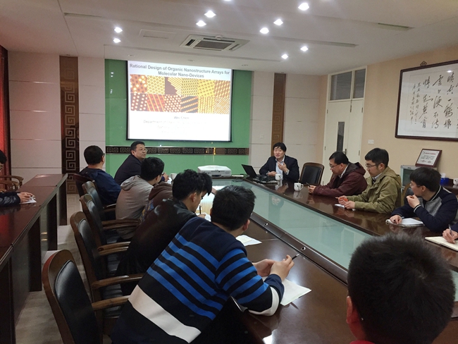 陈伟的报告生动阐述了设计合成具有不同分子取向的多功能分子纳米器件和有机电子元件以及石墨烯表面定向排列的酞菁锰在低压低温下活化N2分子的研究成果,并向师生们详细介绍了石墨烯、金属硫化物和黑磷作为导电材料的优点和缺点、有机半导体材料在制作电子元件方面独特的性能优势。