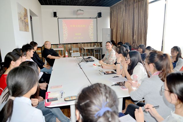 5月10日下午,由美籍华人顾浩樑先生投资建立的外语角举行首秀,顾浩樑先生受邀主持,并与师生做了题为“中美文化比较”的交流活动。英语专业教师伊咏、陆婷以及英语专业的部分学生参加了活动。现场师生围桌而坐,顾浩樑围绕中美文化的差异与大家进行了热烈的讨论,并讲述了自己在美国的求学和创业经历。活动全程以英语交流,气氛融洽,顾浩樑的幽默风趣的口语表达受到同学们的欢迎。