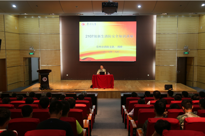 9月19日,2017级新生消防灭火演练在科教城校区体育看台西侧举行。常州消防支队武进消防大队警官为新生详细讲解了常用灭火器的使用方法,并指导新生代表进行了灭火操作演练。9月21日,常州市消防支队宣传科周祥科长在文彰楼报告厅为材料学院新生作了一场生动的消防安全知识讲座。周警官从近期发生的高校火灾案例讲起,重点讲解了校园火灾的危害与预防、消防器材的使用方法、险情的处置以及逃生救助等方面的知识。周警官图文并茂、形象生动的解说,博得了现场同学的阵阵喝彩。此外,今年学校还给每一名新生发放了《学生军训消防安全知识读本》。