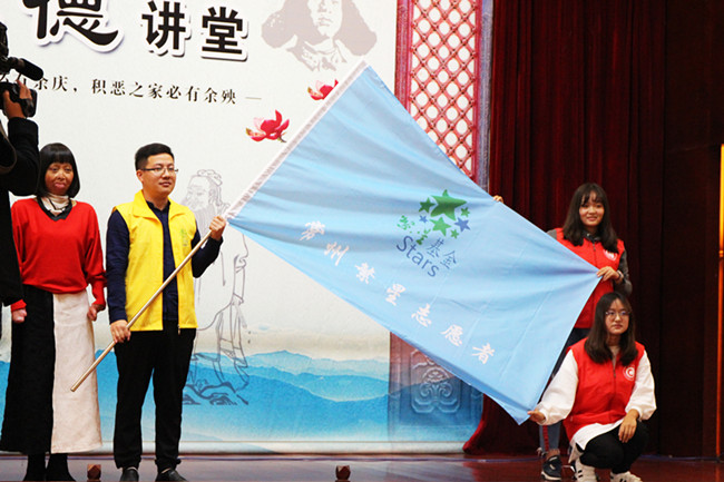 本期道德讲堂以“志愿的心 温暖传递”为主题,常州大学周本卫老师和其他三位道德文明传播志愿者上台领读了“团结有爱、助人自助、无私奉献、共同进步”的志愿者精神内容。通过回顾、深入解读志愿者精神,希望能有更多的人成为志愿者中的一员,将温暖与爱传遍人间。繁星公益基金创办人、最美常州人刘亚娟女士向常州大学石油化工学院食品学院的志愿者们授予“常州繁星志愿者”旗帜。(通讯员 曹婧妤)