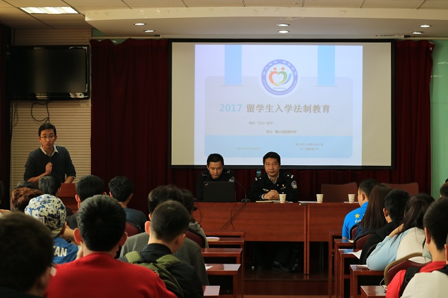 在留学生入学法制教育讲座上,武进区出入境管理大队刘琪队长、钱丹警官讲解了有关外国人居留的法律法规,包括居留许可的办理、护照的保管及报失、出入境法规、人身安全等方面。特别结合治安管理处罚条例对留学生进行了防止违法犯罪的教育,并针对留学生常出现的违法违规现象作了强调和解说。