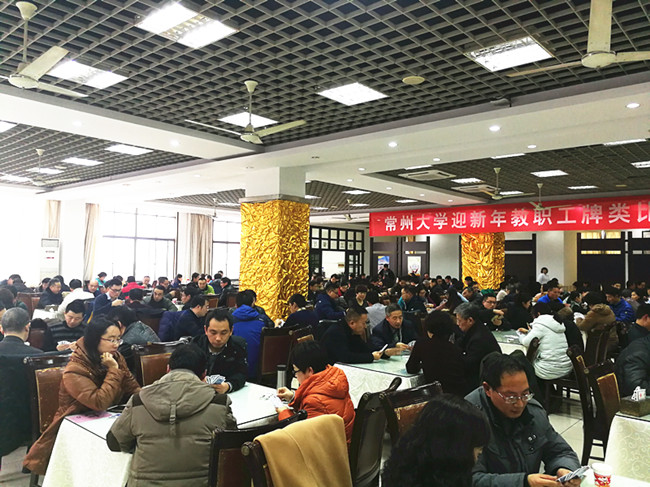 12月29日下午,常州大学科教城校区教工餐厅里人头攒动、热闹非凡,常州大学迎新年牌类比赛正在举行。