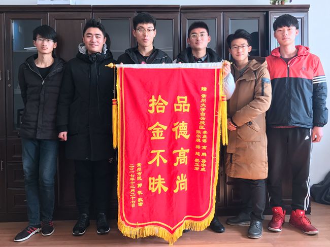 2017年12月25日下午,陈尔康等六名同学在怀德桥附近小区门口发现遗落的钱包,查看后发现里面有若干现金、8张银行卡及2张身份证。几位同学考虑到失主丢了贵重物品后的焦虑心情,因担心失主返回寻找时找不到,便取消了原来的返校计划,同时通过派出所设法联系失主。经过派出所的多方查证与失主取得了联系,并将钱包及所有财物归还失主。郭凯先生通过派出所民警了解到几位同学所在学校、班级和姓名,随后来到常州大学瞿秋白政府管理学院赠送“拾金不昧、品德高尚”锦旗。