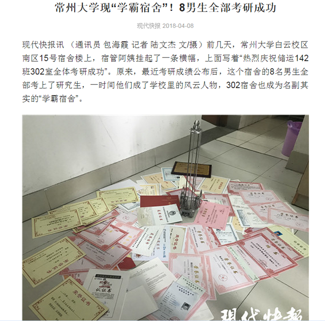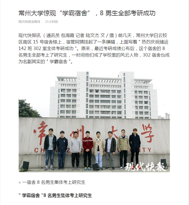 现代快报讯 (通讯员 包海霞 记者 陆文杰 文/摄)前几天,常州大学白云校区南区15号宿舍楼上,宿管阿姨挂起了一条横幅,上面写着“热烈庆祝储运142班302室全体考研成功”。原来,最近考研成绩公布后,这个宿舍的8名男生全部考上了研究生,一时间他们成了学校里的风云人物,302宿舍也成为名副其实的“学霸宿舍”。