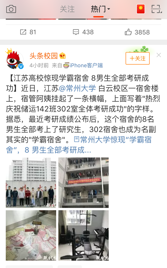 “8个人集体考上研究生,真的不多见。”“这帮哥们太励志了,真的是身边人学习的榜样”“之前听说他们都要考研,居然一下都考上了,太厉害了”……得知8个人集体考上研究生后,大家纷纷前来祝贺,302宿舍也成了学生们心目中的“圣地”。
