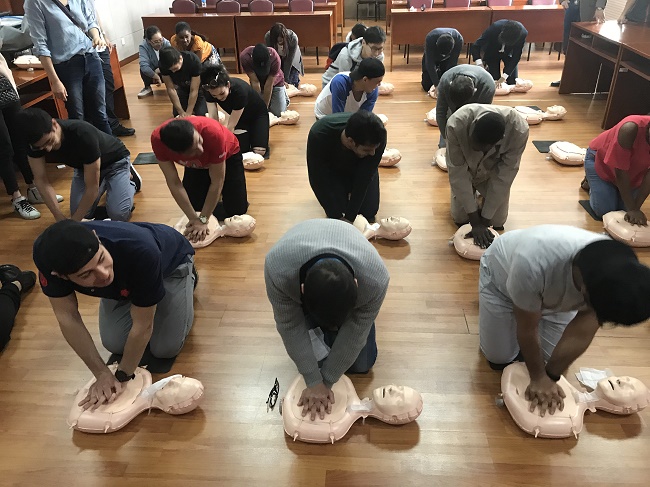 为增强外国留学生在华学习和生活的安全意识和急救技能,4月11日下午,国际交流处在明行楼多功能活动中心举办安全急救知识讲座,邀请常州市第二人民医院阳湖院区联合麻醉科主任邹志清为我校留学生普及心肺复苏急救知识并开展急救技能指导活动。