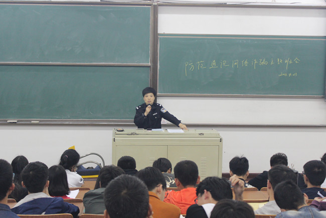 为增强大学生网络安全防范意识,提高大学生的防范能力,全面普及校园安全常识,4月23日,由环境与安全工程学院举办的防范通讯网络诈骗主题班会在w10教室召开,邀请了科教城派出所副所长邹幼红担任主讲。