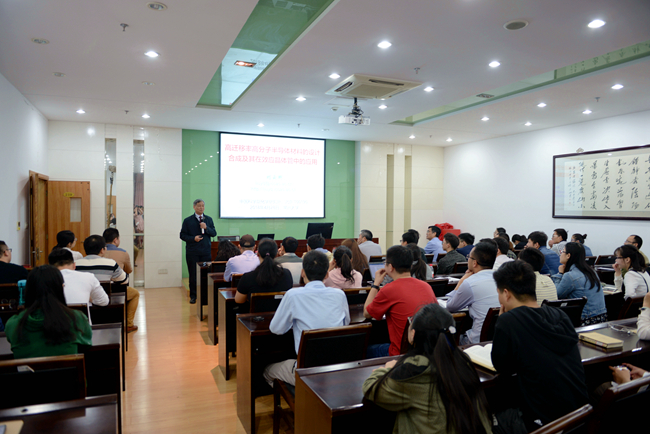 刘云圻首先简要介绍了有机场效应晶体管的概念、目前我国分子材料的研究地位以及其团队在高迁移率材料,包括p-型材料、n-型材料和双极性材料三方面开展的亮点工作。随后介绍了低操作电压器件、三组分集成型光传感器及类视网膜型光传感器,其中,具有光开关功能和存储功能的类视网膜型传感器的研究工作给大家留下了深刻印象。最后,他从材料与化学、器件与物理两方面提出了有机场效应晶体管面临的挑战与前景,并鼓励大家不要拘泥于自己的专业,加强学科交叉,不断学习,勤于实验、勤于思考。报告结束后,刘云圻回答了我校师生代表的提问。