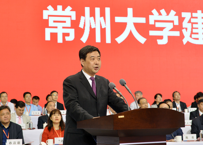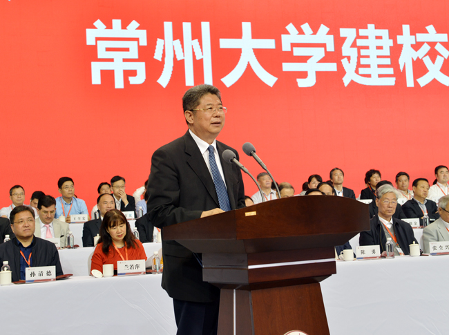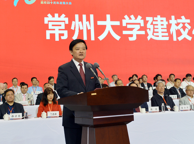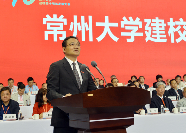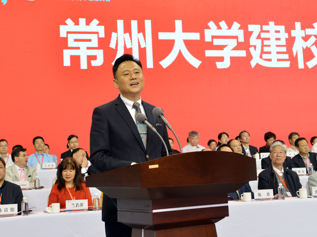 校长陈群代表常州大学致辞。他回顾了常州大学四十年的发展历程后指出,四十年来,学校始终不畏艰难、艰苦奋斗,充分诠释了常大精神;始终上下求索、锐意进取,充分显示了常大力量;始终与时俱进、一往无前,充分展现了常大风采。今天的常州大学,已发展成为一所办学特色鲜明、办学基础扎实、文化底蕴深厚的地方综合性大学。他表示,今后,学校将始终把提高人才培养质量作为立校之本,把服务行业与地方经济社会发展作为兴校之源,把推动内涵式发展作为强校之基,早日建成特色鲜明的高水平地方领军型大学。
