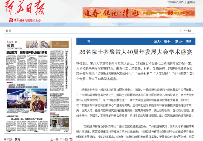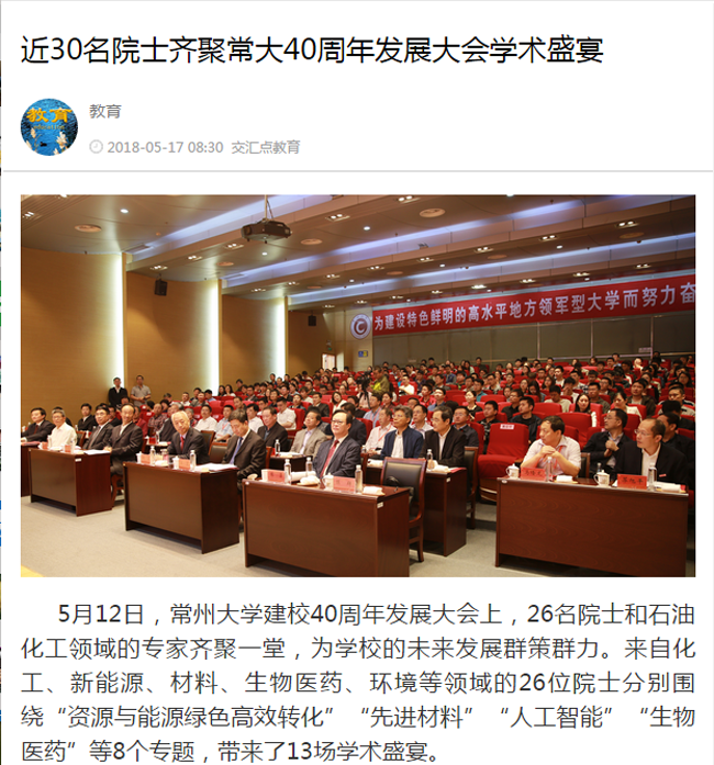 5月12日,常州大学建校40周年发展大会上,26名院士和石油化工领域的专家齐聚一堂,为学校的未来发展群策群力。来自化工、新能源、材料、生物医药、环境等领域的26位院士分别围绕“资源与能源绿色高效转化”“先进材料”“人工智能”“生物医药”等8个专题,带来了13场学术盛宴。
