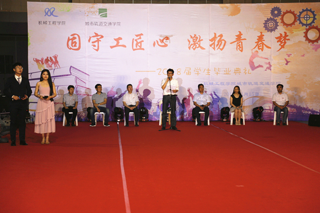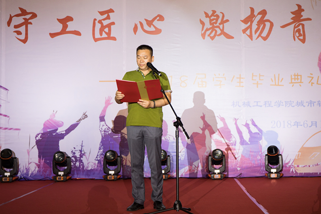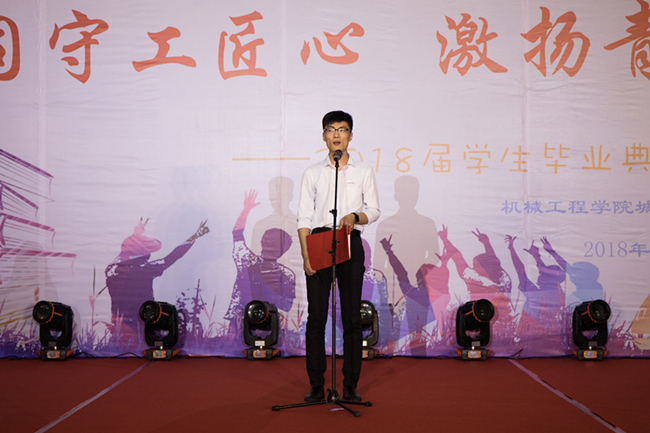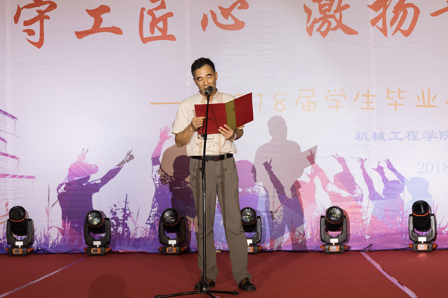 张跃代表全院教职工为毕业生送去诚挚的祝福,并与全体毕业生作了五点分享:一是做认真谨慎的实干者,希望全体毕业生未来都能在自己的岗位上坚守工匠本心;二是做阳光向上的奋斗者,希望全体毕业生都能以阳光、向上的心态去奋斗;三是做善于思考的学习者,用自己的方式加以思考,在自己的模具里铸成自我思想的砂型;四是做勇担责任的卓越者,一如既往地坚持操守,具备追求卓越的精神;五是做甘于淡泊的后排者,从后排中学会生活的智慧,理解人生起落间的淡然,规避人生中的激进冒失。