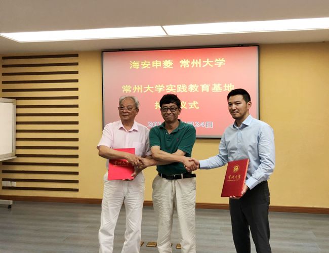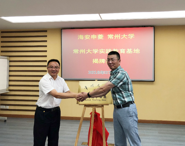 7月25日下午,常州大学与江苏海安申菱电器制造有限公司共建实践教育基地揭牌仪式在海安申菱电器公司举行。海安市科技局副局长赵爱玲、海安市高新区科创园主任陆建银,申菱电器公司董事长李春涛、总经理李申和公司相关负责人,常州大学机械工程学院城市轨道交通学院党委书记柳铭、院长张跃一行参加了揭牌仪式。