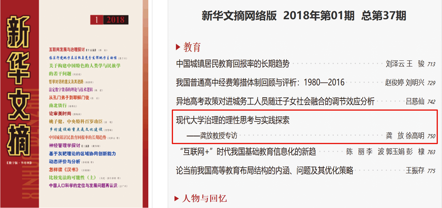 近日,我校龚放教授的理论专访被《新华文摘》2018年第1期网络版全文转载。这篇由常州大学高等教育研究院徐高明研究员采写的《现代大学治理的理性思考与实践探索——龚放教授专访》理论文章,首刊于《苏州大学学报(教育科学版)》2017年第3期,全文约1.6万字。