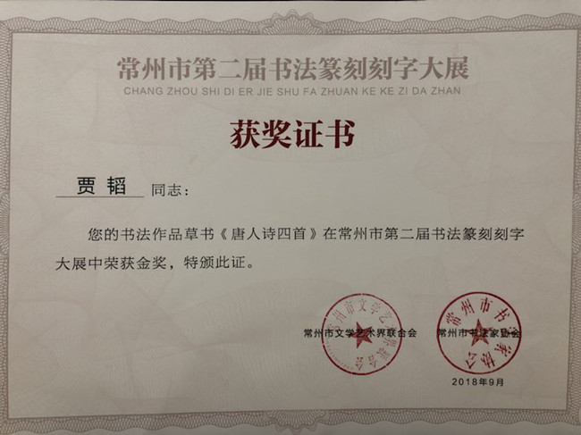 9月6日上午,由常州市文联、常州市书法家协会共同举办的第二届书法篆刻刻字大展在环太湖艺术城开幕。常州大学艺术学院青年教师贾韬创作的草书作品《唐人诗四首》荣获金奖。
