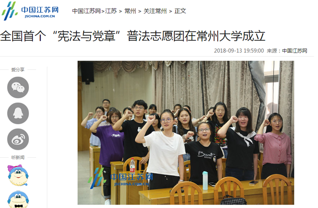 中国江苏网9月13日常州讯(陈慧香 虞宙 赵家玮) 9月12日,常州市首个“宪法与党章”普法志愿团在常州大学史良法学院成立。据悉,这是国内首个以法学院全体师生为普法主体、以“宪法和党章”为专门内容的普法志愿队伍。