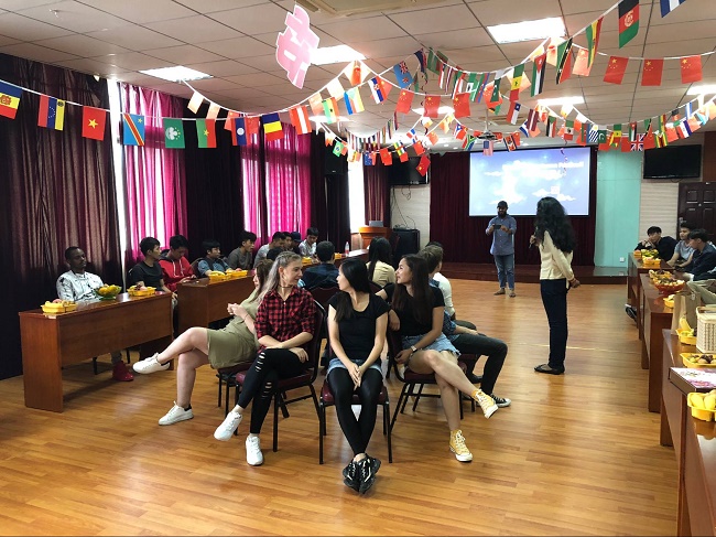 9月21日下午,“中华明月夜 五洲共此情——留学生中秋联欢晚会”在我校明行楼多媒体厅举办。来自德国、泰国、老挝、俄罗斯、哈萨克斯坦、乌兹别克斯坦、巴基斯坦、毛里求斯等30多个国家的留学生欢聚一堂,喜迎中秋。本次活动由国际交流处主办,国际交流处副处长潘娜参加活动。
