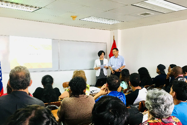 10月13日上午,中国国家开发银行加拉加斯代表处翟启斌先生、陆毅女士做客我校委内瑞拉玻利瓦尔大学孔子学院,为孔子学院师生作了一场《论语和儒家文化》讲座。孔子学院的80多位高年级师生参加了此次文化讲座活动。