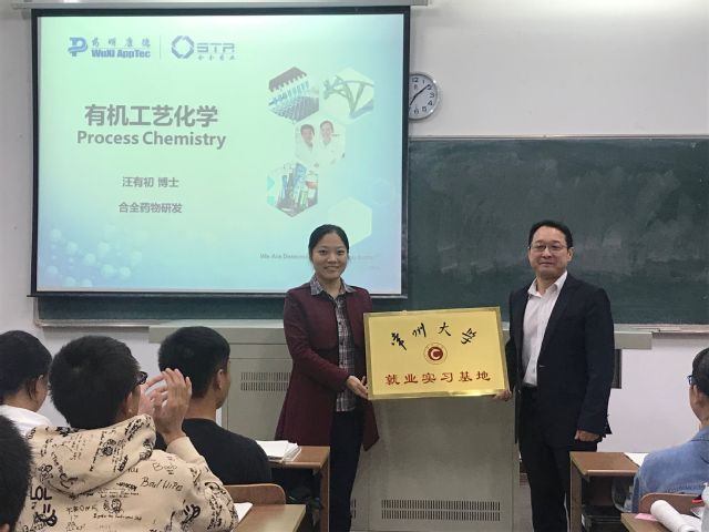 讲座开始前,院党委副书记宣慧与汪有初博士一起举行了合全药业作为石油化工学院就业实习基地的授牌仪式。(通讯员 曹婧妤)