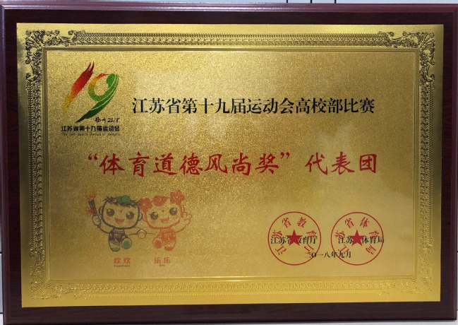 省学生体育协会高校工作委员会总结了江苏省第19届运动会高校部比赛情况,对获得“校长杯”奖、“体育道德风尚奖”代表团、“最佳赛区”的各高校进行表彰,我校被授予“体育道德风尚奖”代表团荣誉称号。