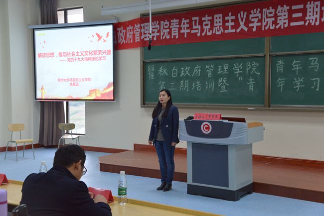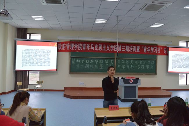 为深入学习宣传贯彻习近平新时代中国特色社会主义思想和党的十九大精神,深入实施青年马克思主义者培养工程,着力引导广大团员青年切实增强“四个意识”、牢固树立“四个自信”,明确时代责任和历史使命,11月14日,瞿秋白政府管理学院举办青年马克思主义学院培训暨“青年学习社”专题学习活动。马克思主义学院李昊远老师应邀出席本次活动。院党总支副书记陈婷、院团委老师以及青马院学员参加了本次活动。