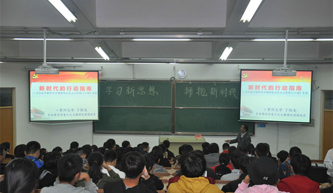为贯彻团省委《关于实施高校共青团“信仰公开课”计划的通知》,引导团员青年加强理论学习,11月14日晚,环境与安全工程学院新思想公开课暨《习近平新时代中国特色社会主义思想三十讲》导读活动于W11阶举行。中共常州市委十九大精神宣讲团成员丁恒龙教授担任主讲,环境学院辅导员老师、青马学院学员及学生骨干参加了本次活动。