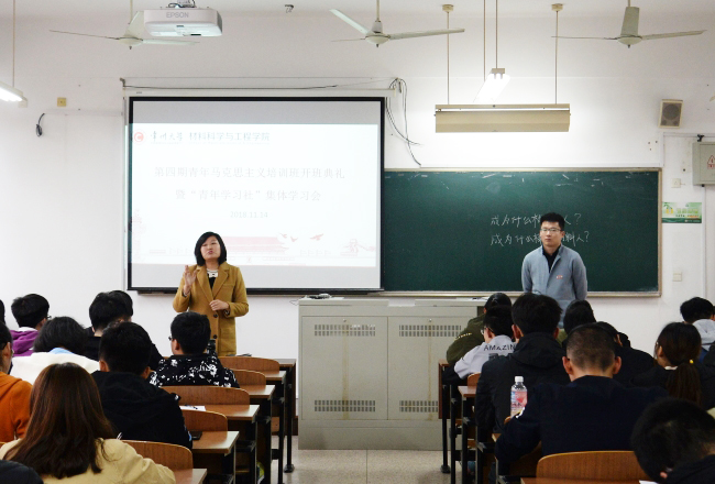 11月14日下午,材料学院第四期青年马克思主义培训班开班仪式暨首次“青年学习社”集体学习会在W2213举办,学院第四期青马培训班全体学员参加了学习,院党委副书记吴青玲出席并作开班动员。