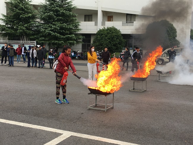 为了提高留学生的安全意识和自我防护能力,11月16日,国际交流处、保卫处组织留学生在武进校区开展留学生新生消防演习活动,对留学生进行了消防知识讲解和灭火器实操训练。